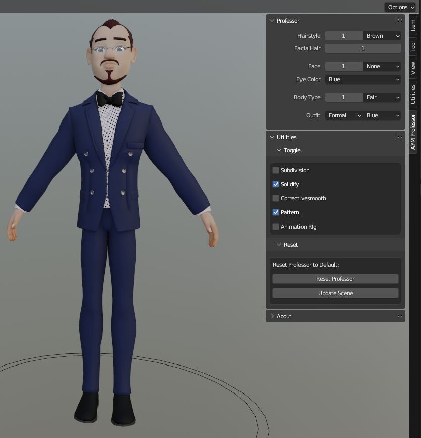 “AYMale Professor” is a character generated and extracted from AYMultiCharacter Male with options to make simple variations.