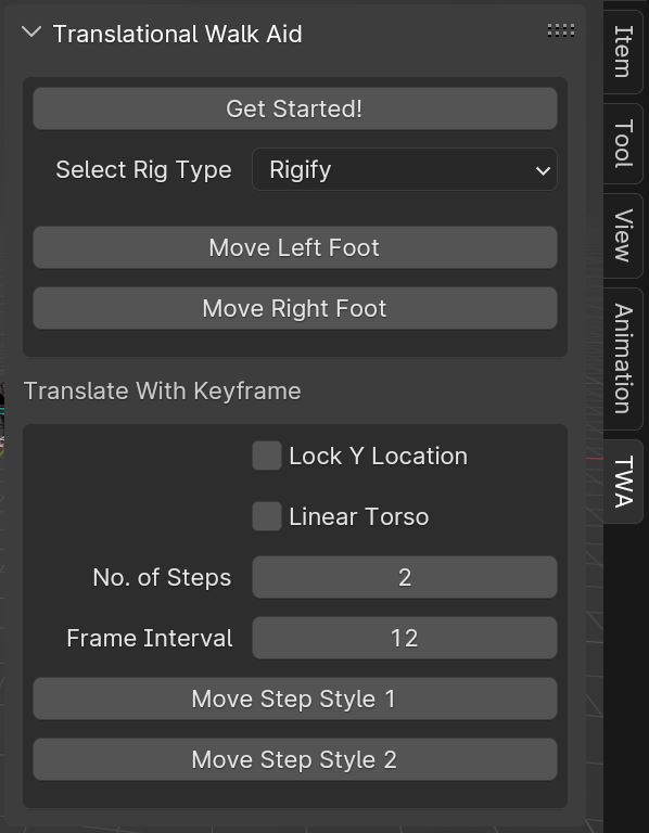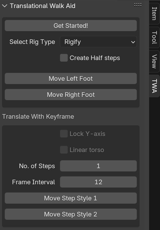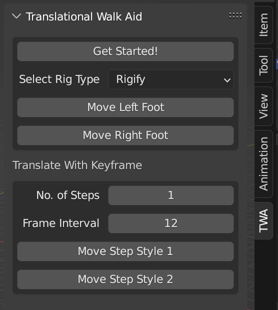After installation, Translational Walk Aid can be found at “3D View > Pose Mode > Sidebar > TWA”