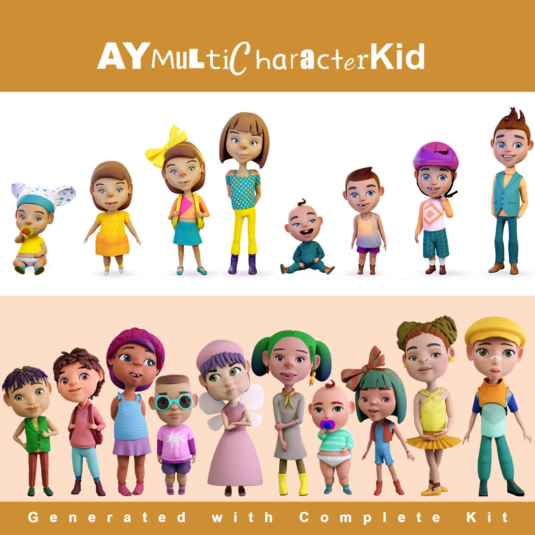 AYMultiCharacter Kid is a character-generating blender kit; that allows users to generate endless 3d animation-ready kid characters with a single click. AYKid generates male and female children with different outfit styles to mix and match.